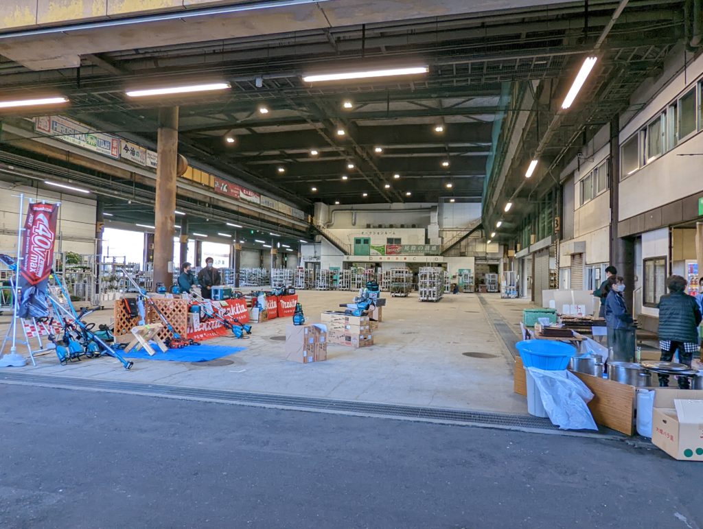 花き棟の株式会社 花満 テント前では株式会社 藤原商会さんが ”マキタ電動工具”の展示即売をされておられますし、株式会社 加茂川さんがお弁当、おむすびの販売に加え、今回は緊急事態宣言の解除を受けて久しぶりに
