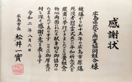 今年8月6日の平和祈念式典は、新型コロナウィルス流行により 縮小して行われました。その為、例年の市場での切花寄付は中止しましたが、株式会社 花満様を通じて広島県花き商業協同組合から、献花をさせていただき、広島市長より感謝状をいただきました。