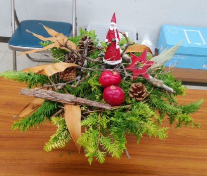 大人クリスマスの演出用にリースとフラワーアレンジメントの実技研修です。