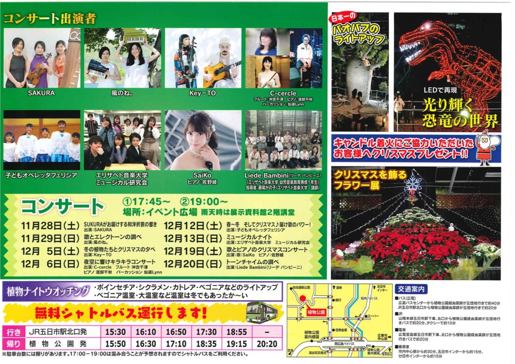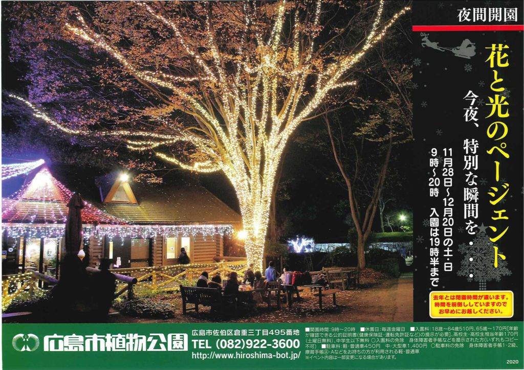 広島市植物公園では、11月28日から12月20日までの土曜日、日曜日に『花と光のページェント』として、夜の時間帯も開園されます。