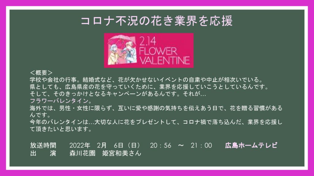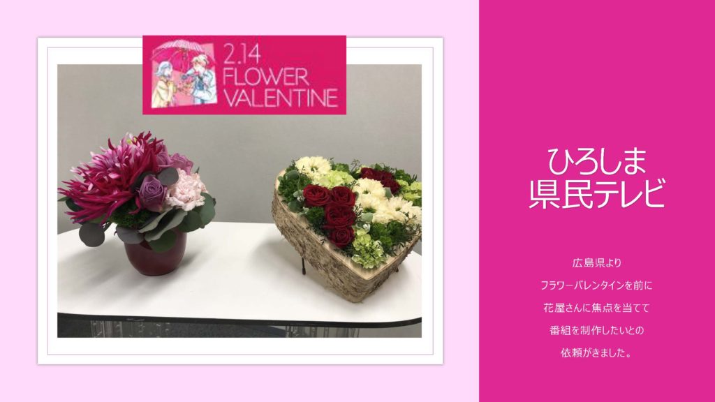 広島県からフラワーバレンタインを前に花屋さんに焦点を当てて広島県民テレビを制作したいとの依頼が届き、組合員である森川花園の姫宮和美さんが出演されます。