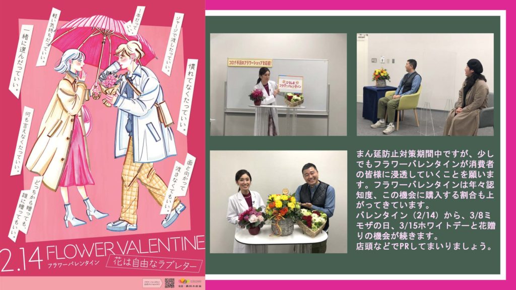 まん延防止対策期間中ではありますが、フラワーバレンタインが消費者の皆様に認知していただき、女性からチョコレートをお贈りされるばかりではなく、お花を添えたり、男性から女性にお花を贈る習慣ができるといいですね。