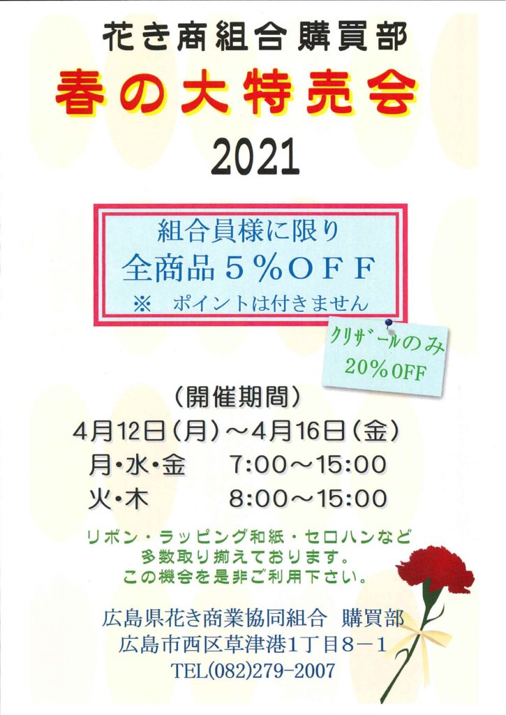2021.04.09 組合員限定 春の大特売会 開催‼ 4月12日(月)から4月16日(金)まで 花き商組合 購買部にて 春の大特売会 を開催致します‼ 組合員様に限り 全商品5%OFF この機会をぜひ ご利用くださいませ。 共有:Facebookいいね:いいね 読み込み中… SNSでもご購読できます。 コメントを残す コメントをキャンセルコメント * 名前 * メールアドレス(公開はされません。) * 次回のコメントで使用するためブラウザーに自分の名前、メールアドレス、サイトを保存する。 Δ