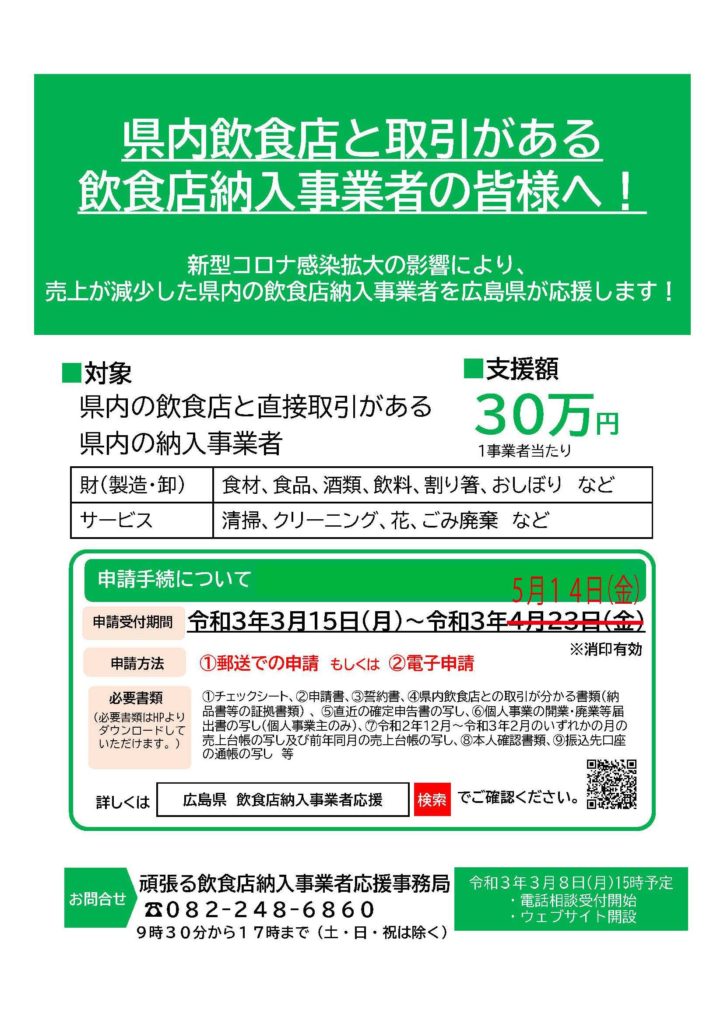 広島県の「頑張る飲食店納入事業者応援金制度」受付期間延長!!