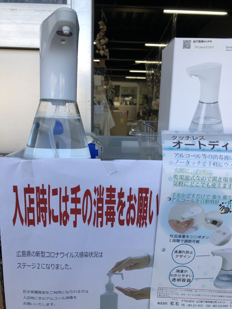 花き商購買部の入り口に消毒液を置いてあります。