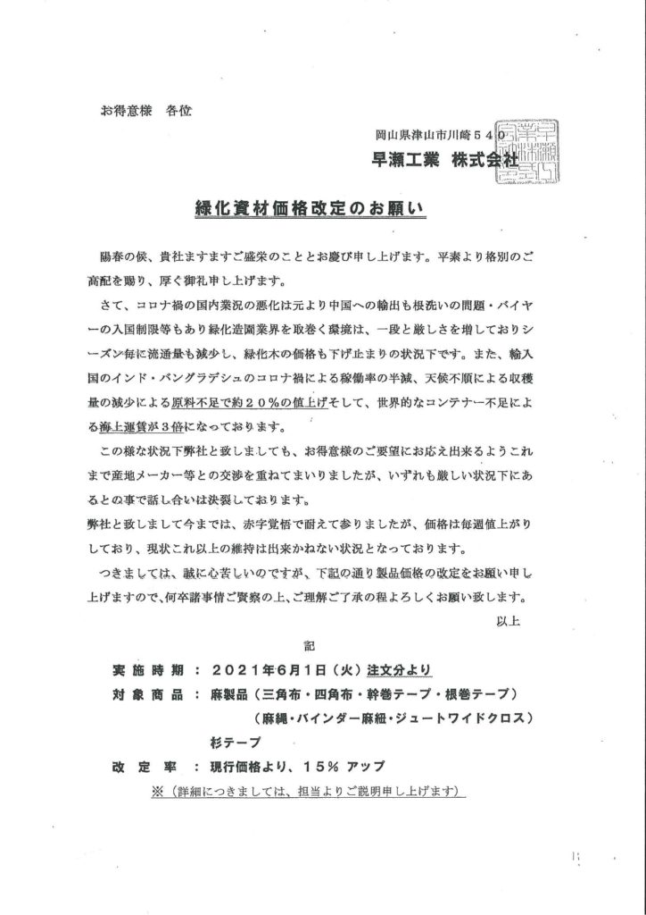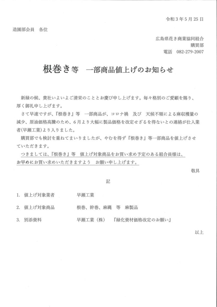 6月1日ご注文分より、根巻・幹巻・麻縄等が値上げします。
