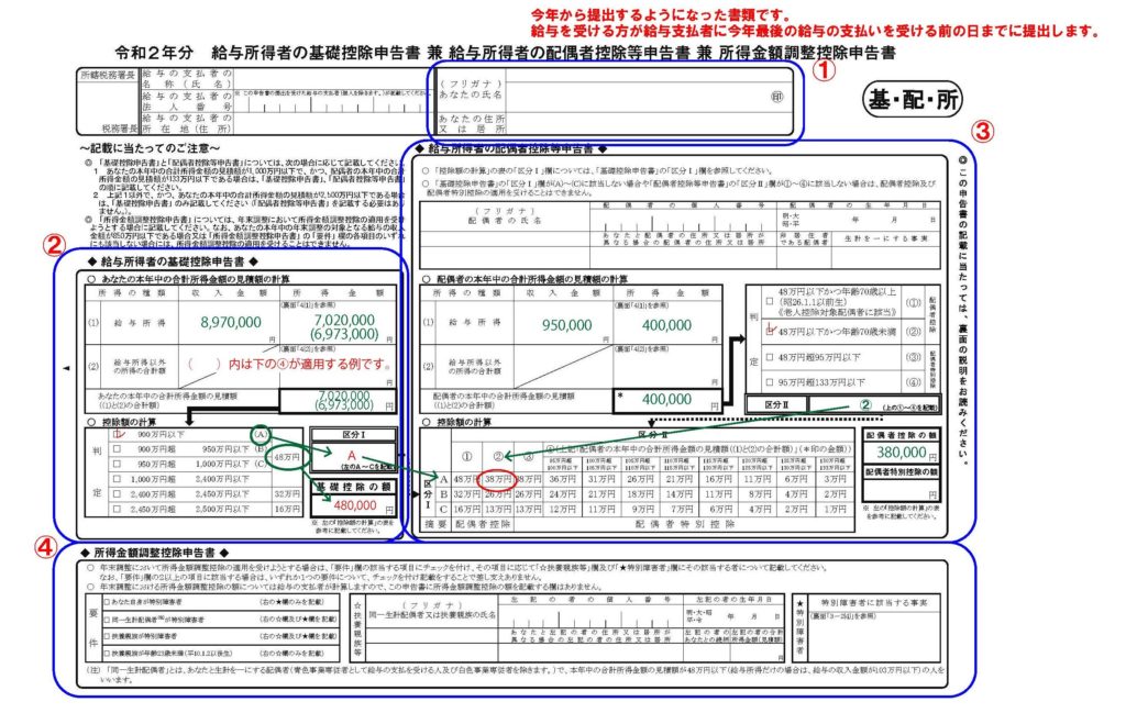 新たに従業員の方に提出いただく書類は「令和2年分 給与所得者の基礎控除申告書・給与所得者の配偶者控除等申告書・所得金額調整控除申告書」という長ったらしい名称の書類です。