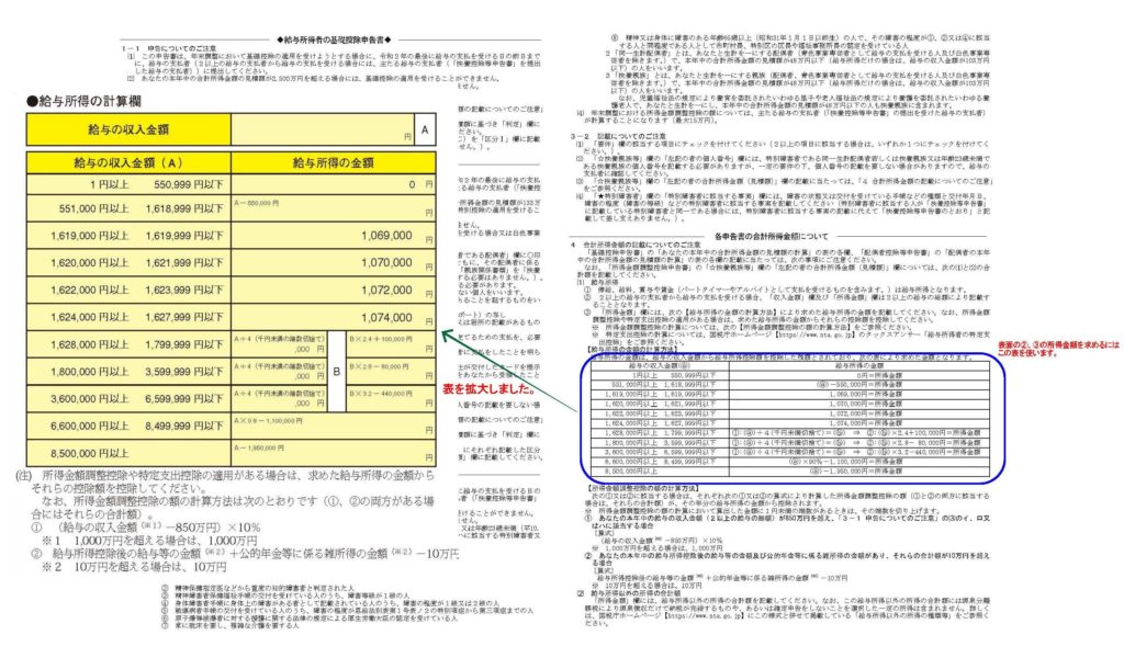 この例でいくと、給与所得の金額が900万円以下ですので区分Ⅰは(A)、基礎控除の額は480,000円ということになります。