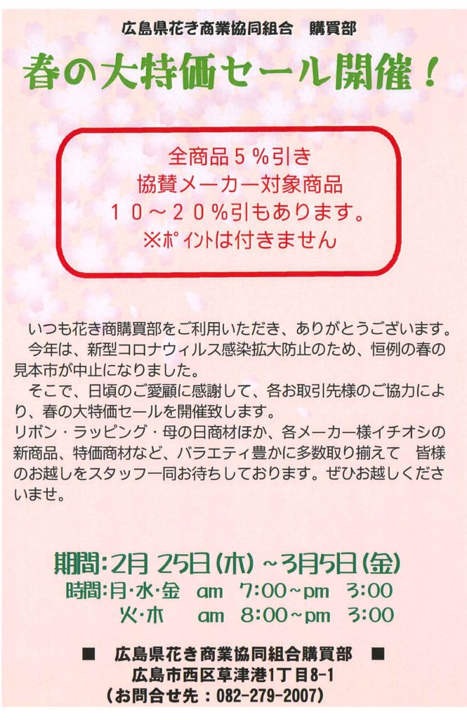 日頃のご愛顧に感謝しまして、各お取引先様のご協力により、春の大特価セールを開催致します。