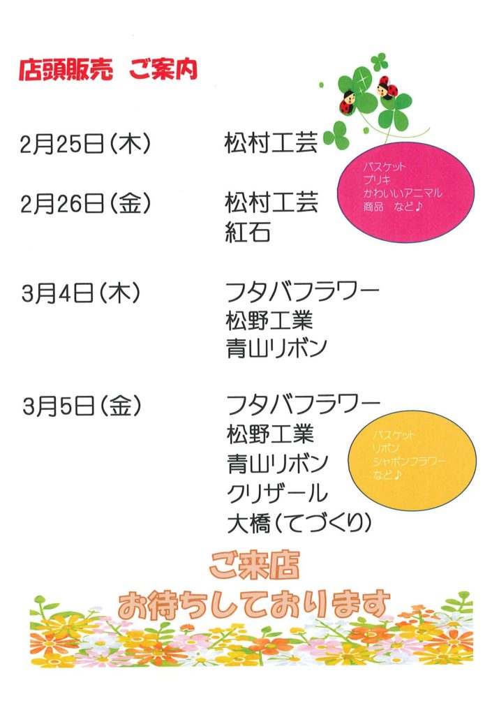 リボン・ラッピング・母の日商材 ほか、各メーカー様イチオシの新商品、特価商材など、バラエティ豊かに多数取り揃えて 皆様のお越しをスタッフ一同お待ちしております。